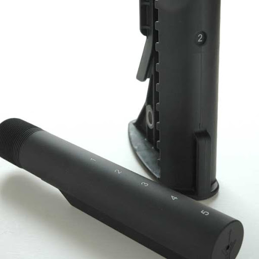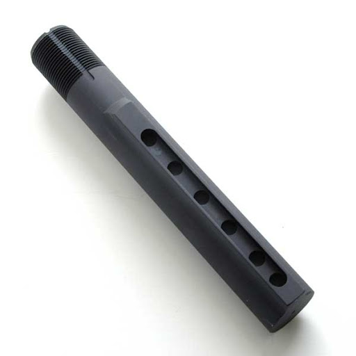 LMT製のバッファーチューブ。チューブの根元が一段絞り込まれた独特のデザイン。ミルスペックの6ポジション。チューブ直径29.1mm、内径25.3mm、凸幅12.6mm、凸高36.75mm。チューブが絞り込まれた部分の直径は28.8mmで、この部分に取り付けるオプション(スリングアダプターなど)を使用する際は注意が必要。 |