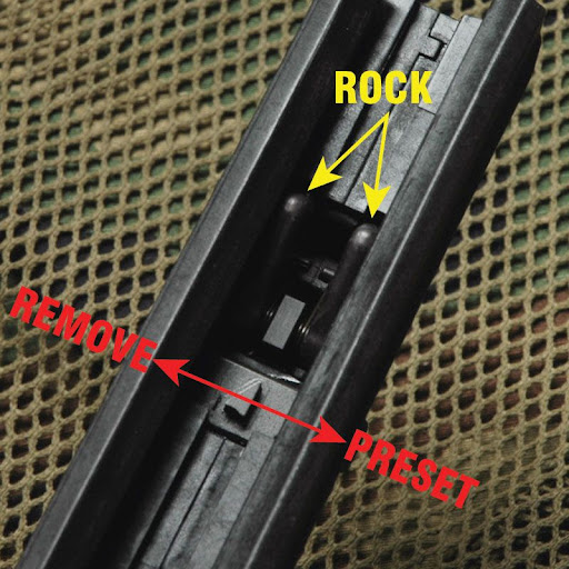 一番縮めた位置(Position0)からPosition6まで7段階・84mm可変する。0~5の間はレバー操作だけで可能だが、5~6への移行はサイドに設けられたスライドボタン同時に操作する必要がある。具体的にはPosition5でスライドボタンをPRESET側から押し込みロックレーバーを解除するとPostion6に移動できる。更にPostion6でスライドボタンをREMOVE側から押し込みロックレーバーを解除すると、ストックボディーを取り外す事ができる。