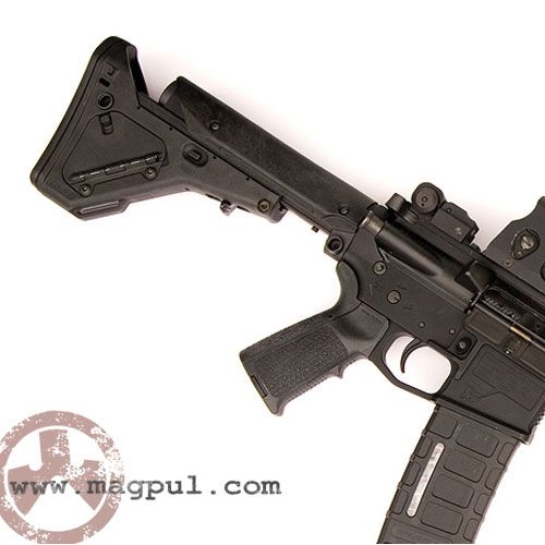 UBRはUtility/Battle Rifleの頭文字。MSS M93で一定の評価を得たMagpulが、更にデザイン・機能を追及したM4/M16系バットストックの意欲作。専用のレシーバーエクステンションに固定されるメインチューブと、その下でスライドするストックボディーの2ピース構造。スライド部分は金属パーツで構成され、可変式ながらブレはほとんど感じられない。M93のように尖った部分のない流線型のデザインで、装備やスリング等が引っかかる心配も少ない。0.55"厚のバットパットはCTRと共通で標準装備。