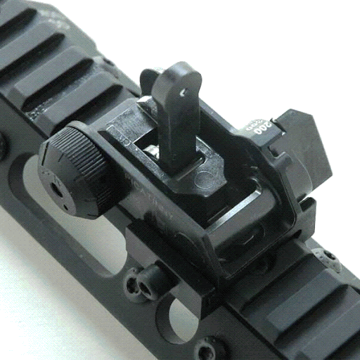 レンジ調整の様子。画像サイズの都合で省いてあるが実際には200m・300m・350m・400m・450m・500m・550m・600mの8段階で移動する。M4カービンで300m、M16A4では350mの位置がイニシャル。この位置でフロントサイトと同じ高さとなる。レンジ調整のレバーも大柄なデザインでグローブをしたままでも扱い易い。サイトポストの基部にはスプリングのテンションが上方向にかかっており、これをカム状の横棒が抑えている構造。カムはレバーに直結され、レバーを動かすとカムが動き、結果サイトポストが上下する。