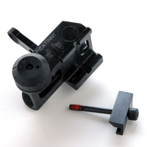 サイトポストを倒した状態。ロープロファイルと言えるほど低くはないが他の光学サイトの邪魔にならない程度にはフォールディングできる。ウィンテージ調整のダイヤルは大きく扱い易い。適度に硬さのあるダイヤルで不用意に位置がずれる心配は不要。本体右側にはピカティニー規格に則った製品であることを示すPICATINNYのマークとロゴが入る。
