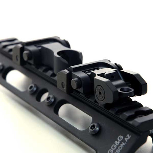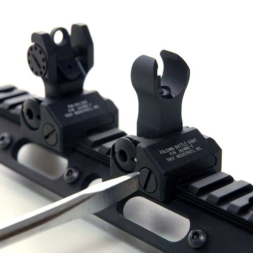 TROYのフォールディング・バトルサイトはアイアンサイトのデファクトスタンダード。画像のフロントサイトはHKスタイルのFBS-A4F-BLK。ポスト(照星)をサークル状のガードがカバーする。ポストはM4形状。エレベーションの調整が可能で.50MOA/1クリック。サイト本体は航空機グレードのアルミ材にタイプ3ハードコート+テフロンコート、ネジなどのスモールパーツはステンレス製。フォアーアーム(MIL-STD 1913)にマウントする。シェープがたいへん美しい。