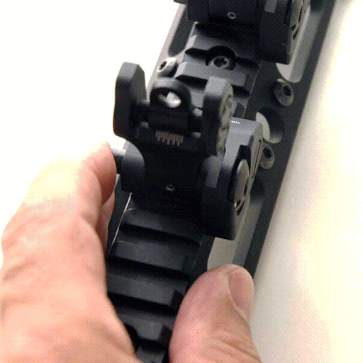 倒した状態の画像。この状態の高さはフロントが0.5インチ、リアが0.46インチ。他の光学サイトの邪魔にならない。F/Rとも前→後方向に倒れる。